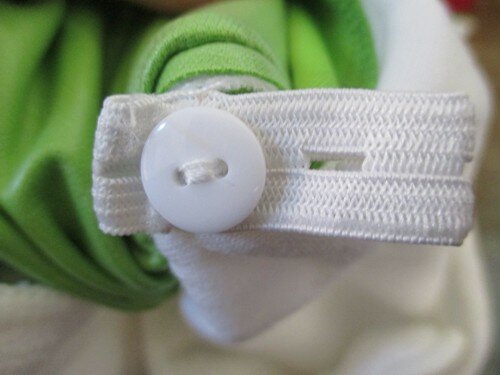 This week I've finally got round to trying a nappy on Amy only to find that I just couldn't get it to fit right. These nappies are billed as "birth to potty" - they have an array of poppers round the waist for the perfect fit and then you can tighten the elastic on the legs. As I was reading the instructions for this - which give suggested positions for weight ranges - I got really confused. Turns out if you turn the nappy completely inside out there's a strip of elastic with a button - much like you get on the adjustable waist of a pair of children's trousers.
